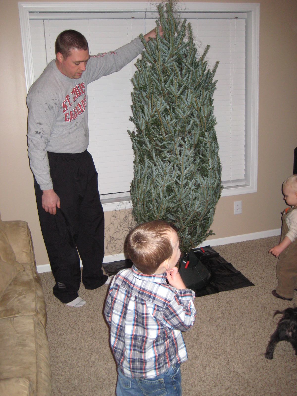 I have decided we need an extra set of hands.  It's extremely hard to video tape/take regular pictures and keep the kids out of the way, all while telling Karsten which way to hold and turn the tree.